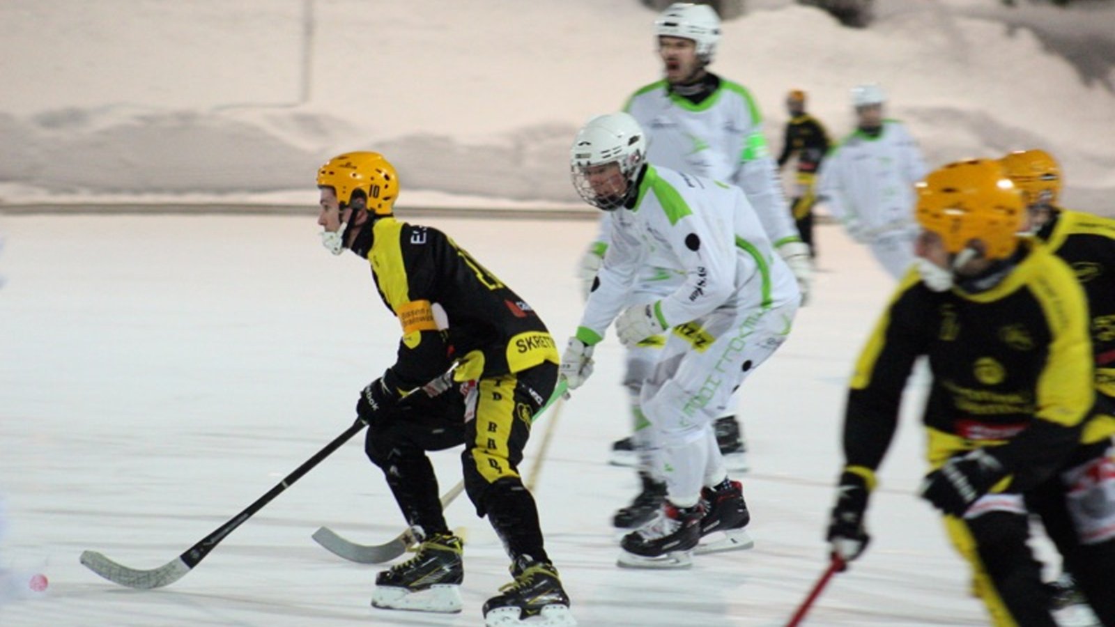Så gikk det noen minutter, med raske vekslinger mellom hvem av lagene som hadde ballen. Isen var såpass dårlig at spillerne knapt klarte å føre ballen 10 meter. Høvik flakset inn et skudd og ledet 3-2. Men så var Truls frempå mens Skeid hadde en spiller utvist, og styrte inn 3-3 målet. Lagene var like langt. Så fikk Høvik litt bedre sving på spillet, og scoret både 4-3 og 5-3, før lagene gikk til pause.